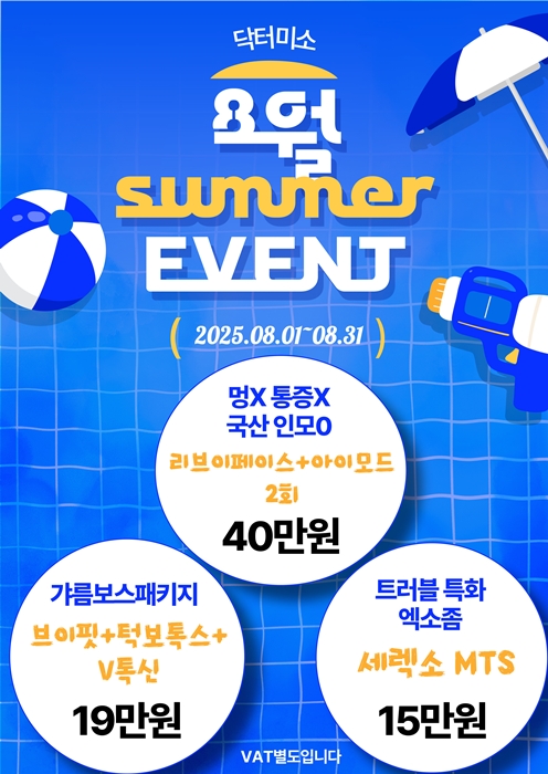 ★닥터미소 8월 달달이벤트★♥_트러블 특화 엑소좀세렉소 MTS1회 22만원 ▶ 15만원♥_갸름보스패키지브이컷+턱보톡스+V톡신1회 33만원 ▶ 19만원♥_멍X 통증X 국산 인모0리브이 페이스모드+아이모드 2회2회 66만원 ▶ 40만원━━━━━━━━━━━━━━━━━━━━- 기간: 2025.08.01~2025.08.31- 모든 시술 VAT별도■ 문의/예약Tel....